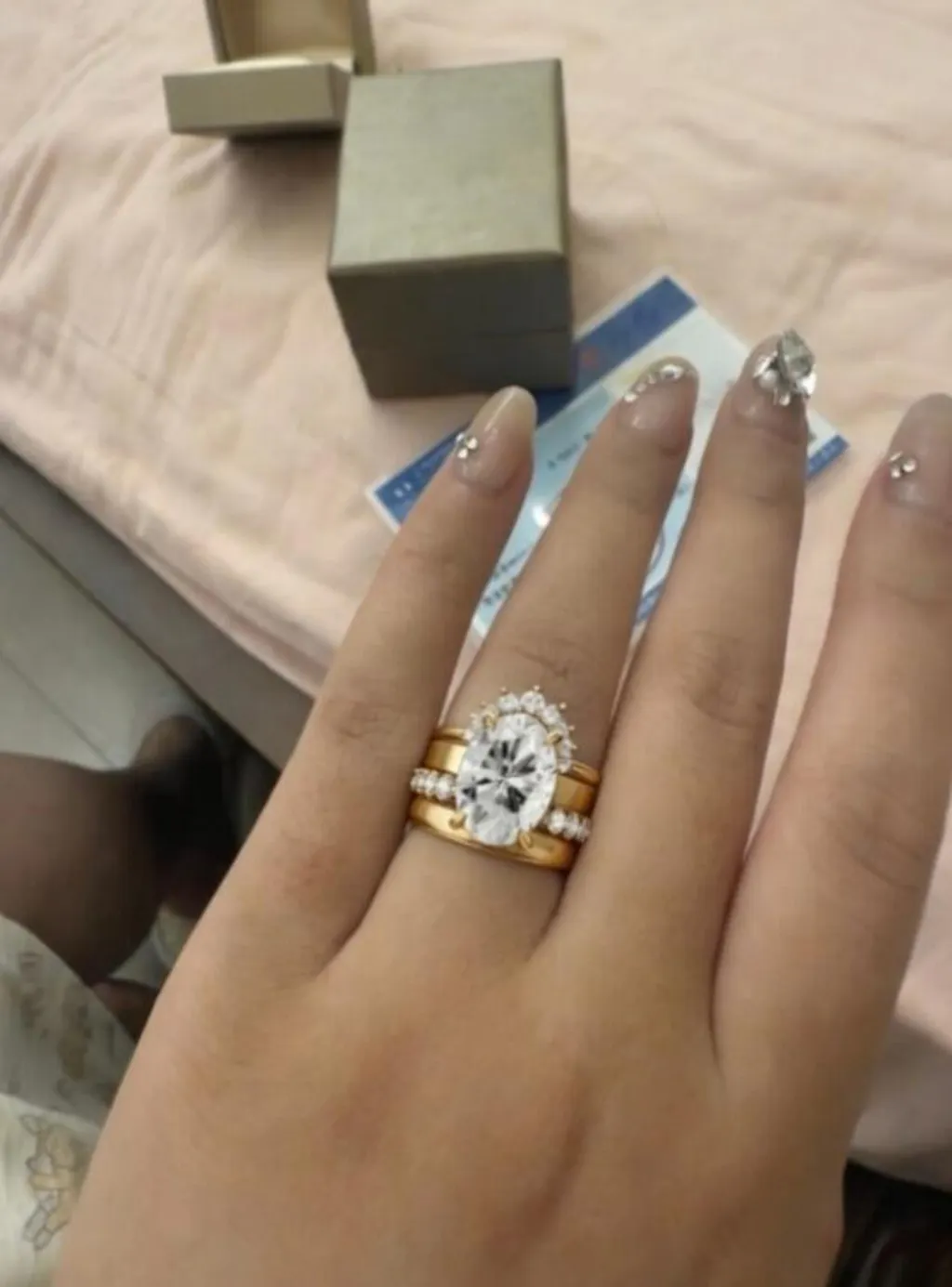 - Elegant oval-cut center stone paired with coordinating band for a complete bridal engagement set